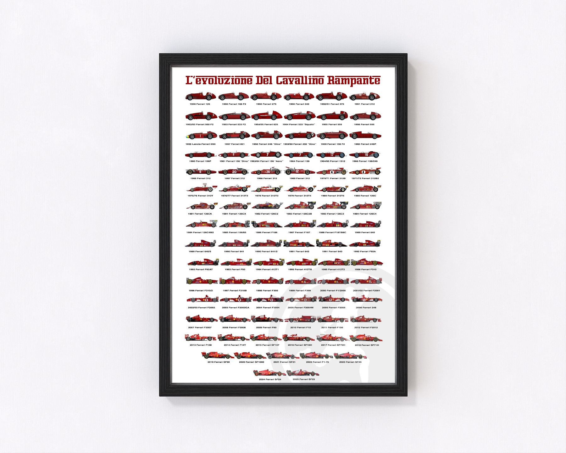 Updated for the 2025 season, If you're a fan of motorsports and the iconic Ferrari brand, our history of Ferrari F1 cars poster is a must-have for your collection. Featuring a stunning design and vivid colors, this poster showcases the legendary cars that have helped make Ferrari one of the most successful teams in Formula 1 history.