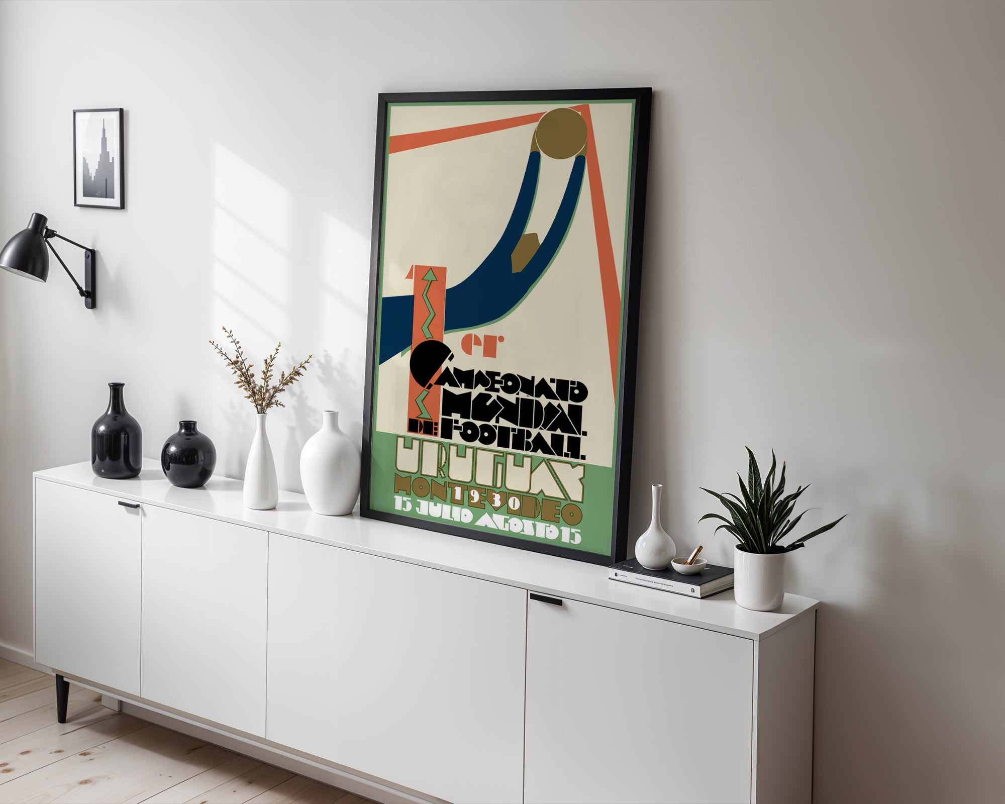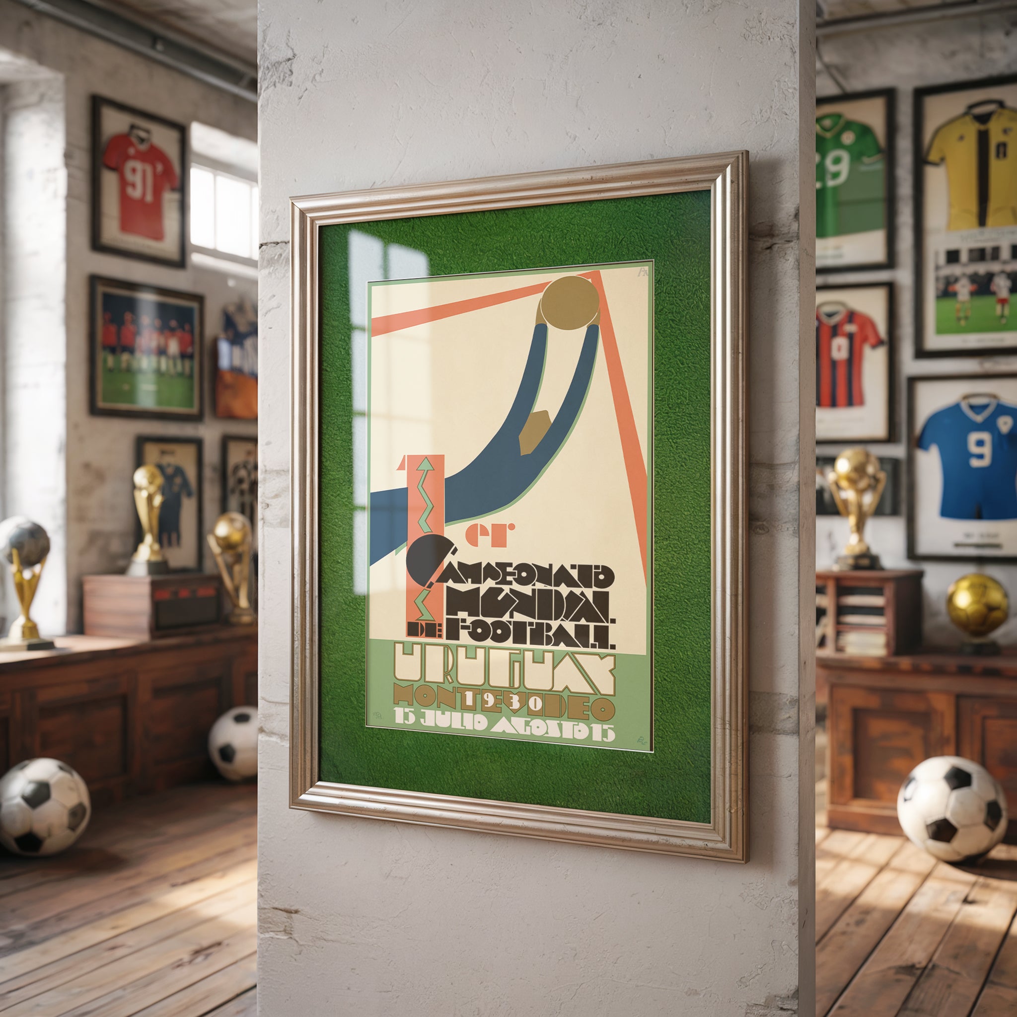 As the host country and eventuAts and collectors alike. It celebrates the very first edition of the FIFA World Cup, which took place in Uruguay in 1930. The poster features a striking design with bold typography and imagery that captures the excitement and spirit of the event.