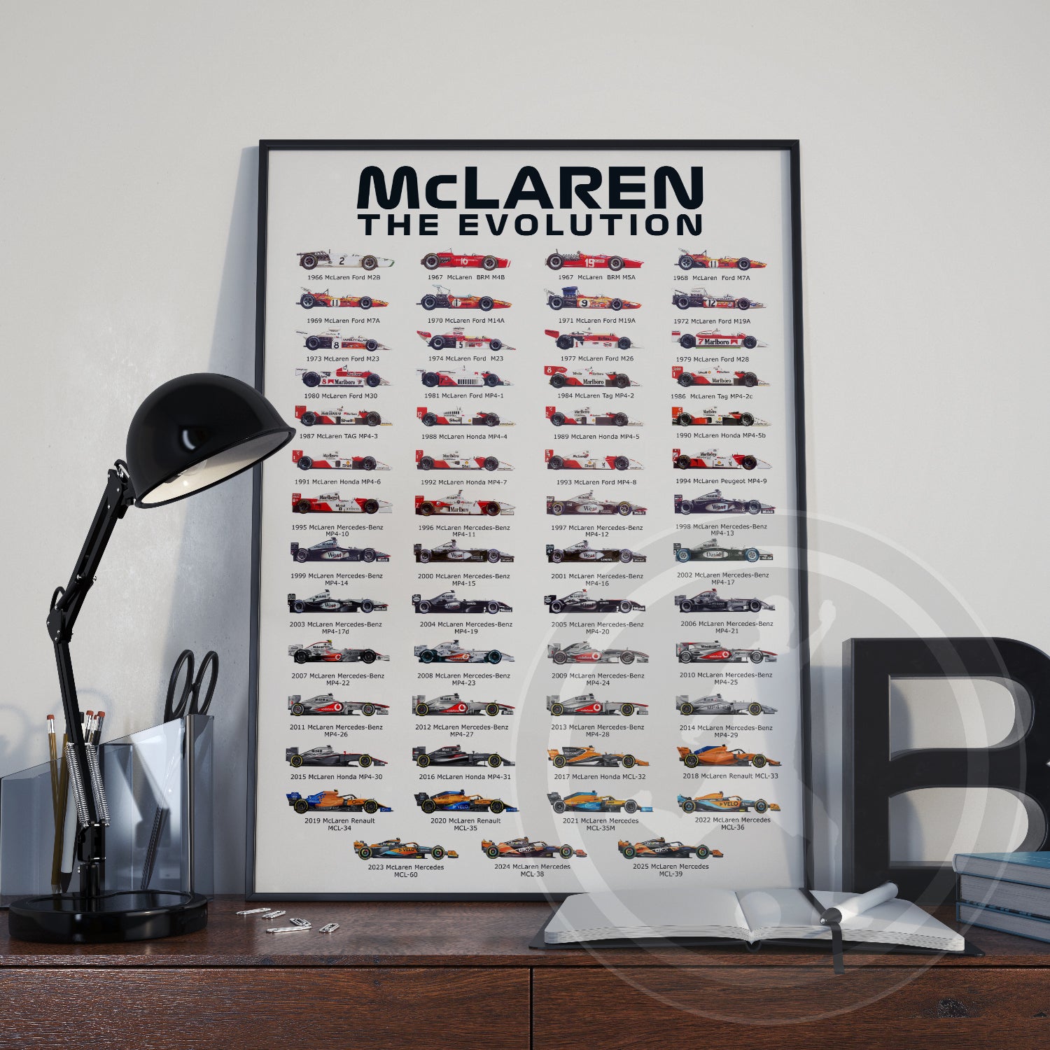 Whether you're a diehard McLaren fan or simply appreciate the beauty and engineering of high-performance cars, our History of McLaren F1 Cars poster is a must-have addition to your collection. Order now and take your love of McLaren to the next level!